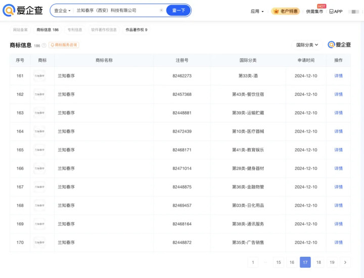 与此同时,与辉同行(北京)科技有限公司2025年4月将多枚“兰知春序”商标转让至兰知春序(西安)科技有限公司,上述商标申请于2024年12月,国际分类涉及健身器材、医疗器械、广告销售等,当前商标状态均为等待实质审查。