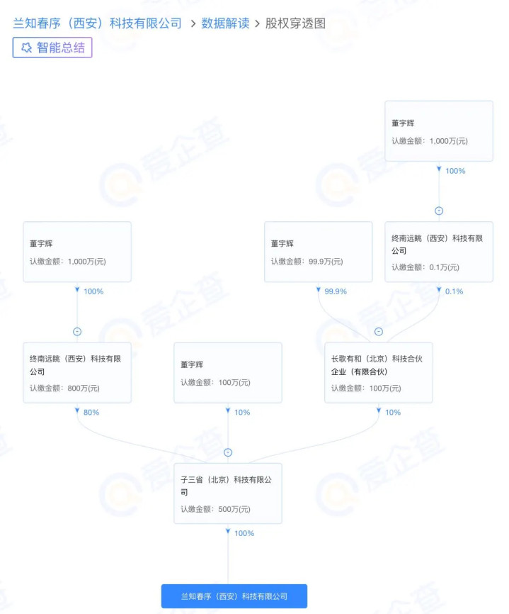 股权穿透图显示,该公司由董宇辉间接持股。主要人员信息显示,董宇辉任该公司实际控制人、董事兼总经理。