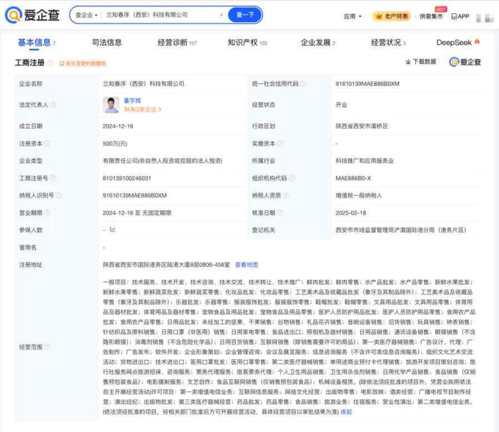 据爱企查App,兰知春序(西安)科技有限公司成立于2024年12月,法定代表人为董宇辉,注册资本500万元人民币,经营范围包括日用百货销售、互联网销售、电影放映、酒类经营、广播电视节目制作经营等。