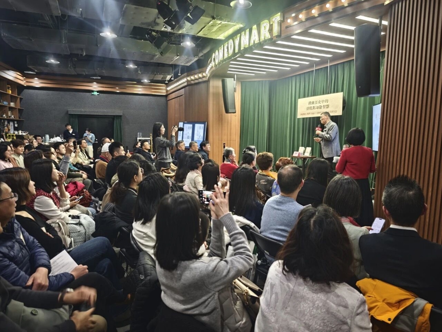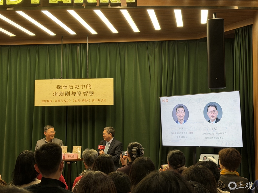 上海书城六楼小剧场,3月8日举办的《铁律与人心》《治世与烟火》新书分享会就像一场法律人的脱口秀,复旦大学法学院教授郭建与上海金融法院二级高级法官符望、方达律师事务所合伙人季诺的对谈,话题跨度从“法理刚性”到“人情温度”,从“治世理想”到“烟火现实”,让台下掌声笑声不断。